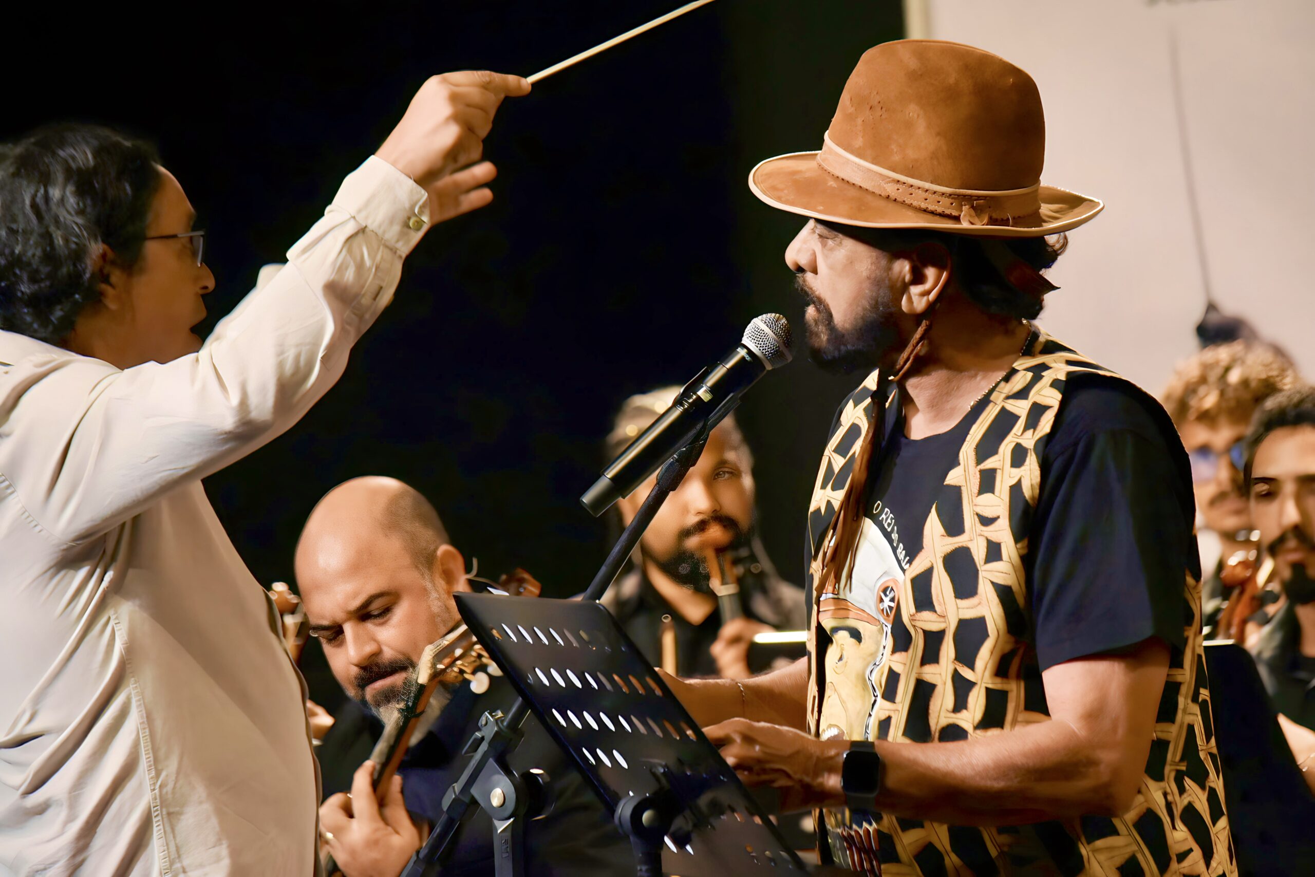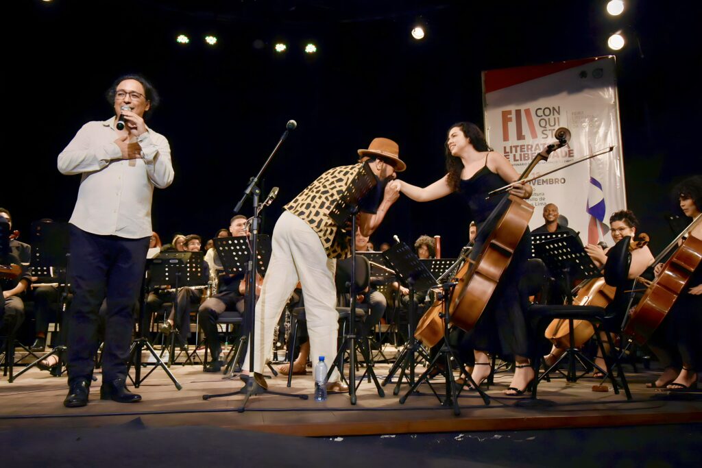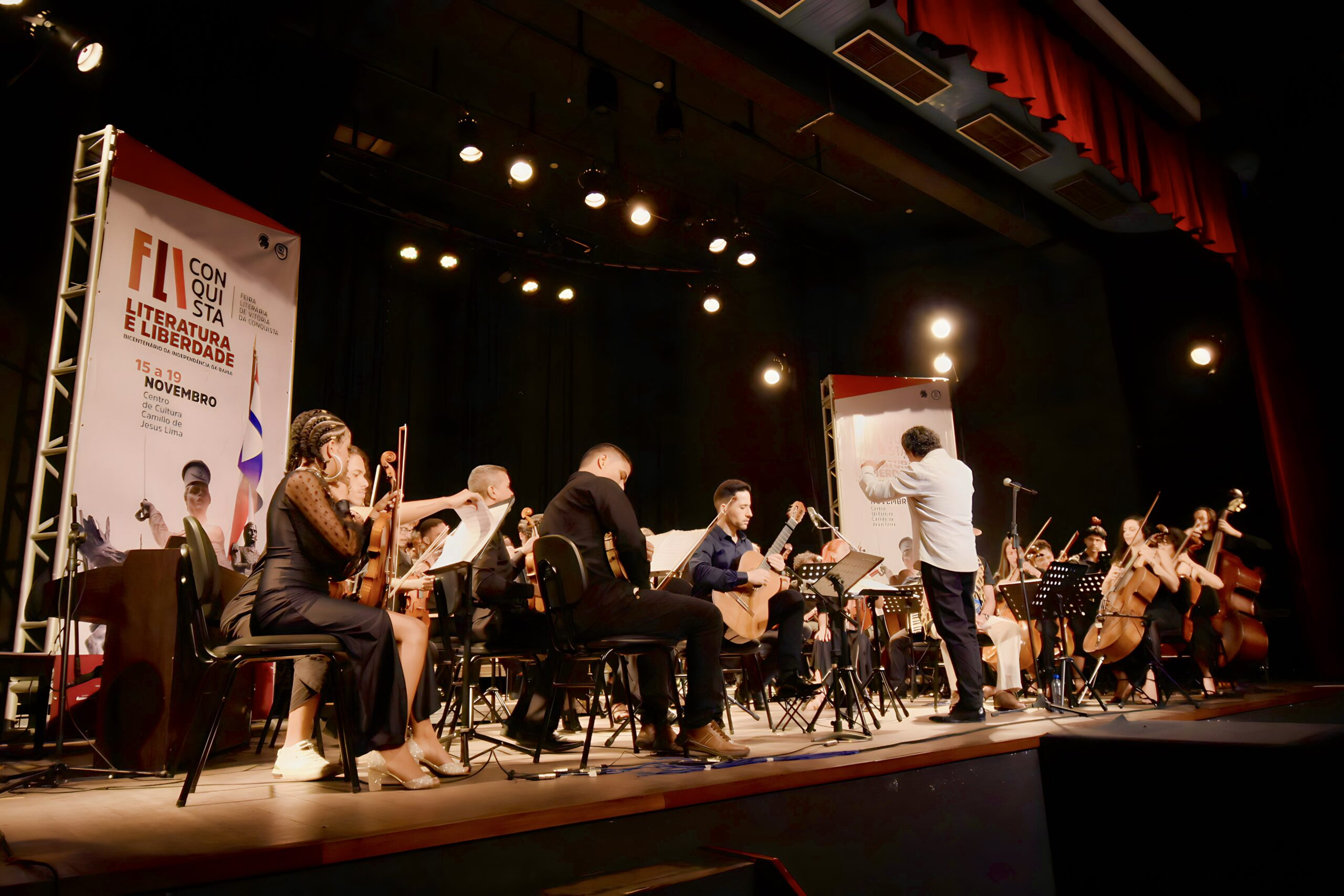 Instrumentos de corda e sopro, um conjunto de coral, a voz potente do cantador Xangai e as precisas batutas do maestro João Omar deram vida à paisagem sonora da Fantasia Leiga Para Um Rio Seco, que encerrou a FliConquista no último domingo (19) como um marco cultural histórico. Para surpresa da plateia, Elomar juntou-se a ela para apreciar o espetáculo.